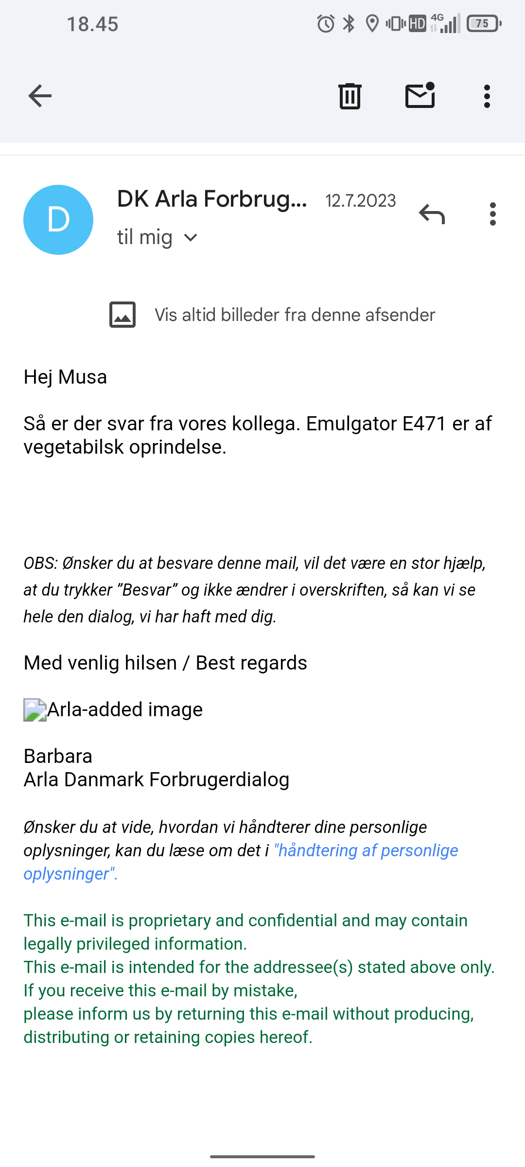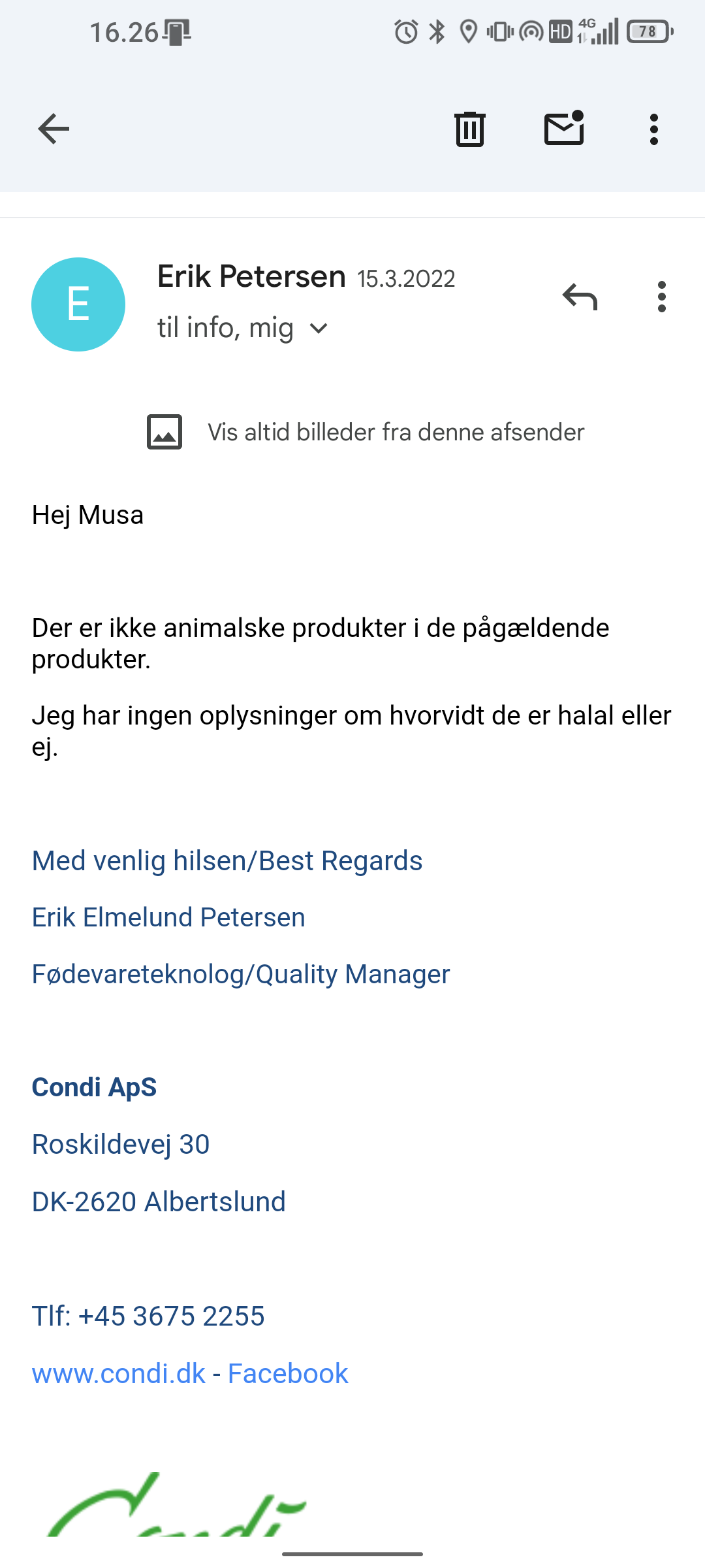 Kort guide til e numre, e numre er ingredienser emulgatorer eks. på e numre som skal tjekkes hvis det ikke står på æsken er E471 Mono og diglycerider af fedtsyrer denne E-nummer er ofte brugt men ofte er det vegetabilsk, hvis lecitiner eller vegetabilsk er skrevet ved denne e numre er det halal, hvis animalsk er beskrevet eller intet skal der beskrives halal på varen er det ikke aktuelt skal producenten kontaktes eller varen skal kasseres ikke købes, husk og undersøg e numrene halal check app´er findes til hjælp, bemærk hvis vegansk eller vegatarisk er beskrevet er det halal med mindre det indeholder alkohol.