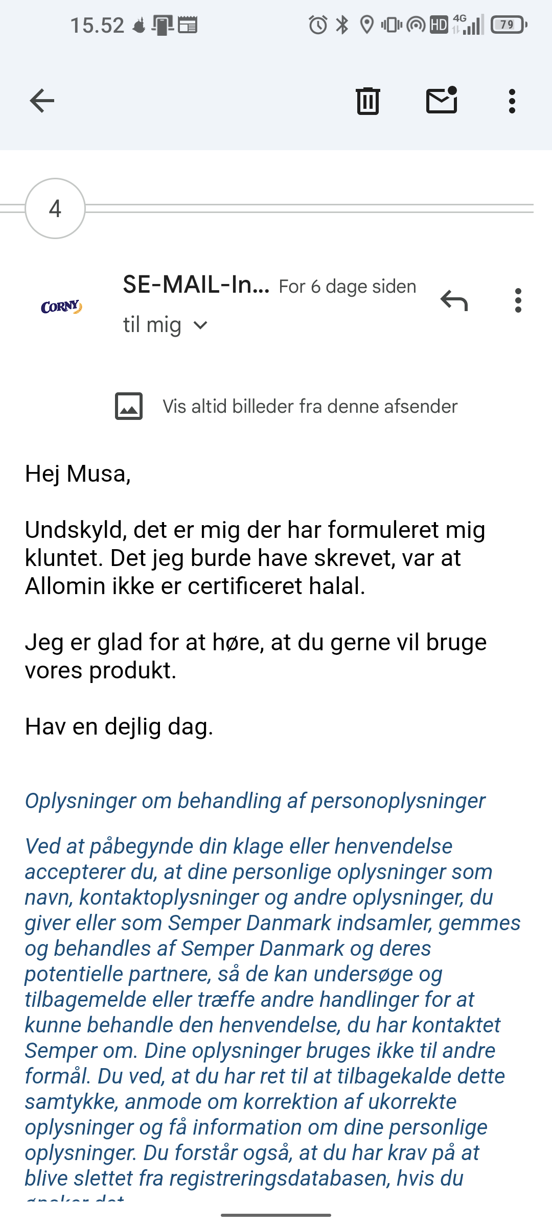 Semper Allomin produkter er halal, men de er ikke verificeret halal, Semper modermælk erstatning produkt indeholder fiskeolie og mælke produkter, det er med til det ikke er vegetabilsk eller vegansk, men det er halal.