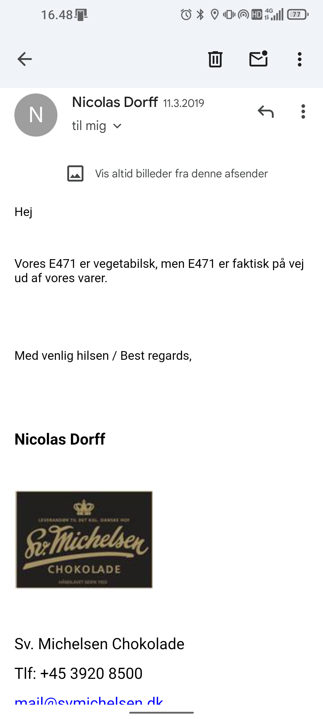 SV Michelsen Chokolade indeholder E471 denne er vegetabilsk.